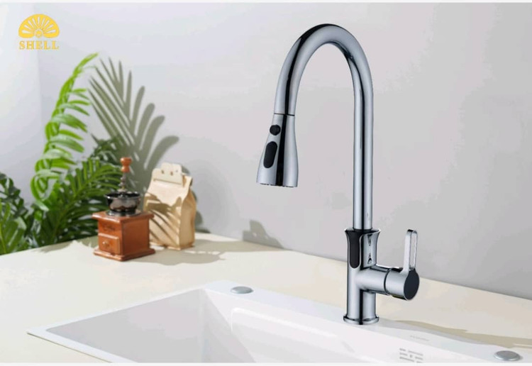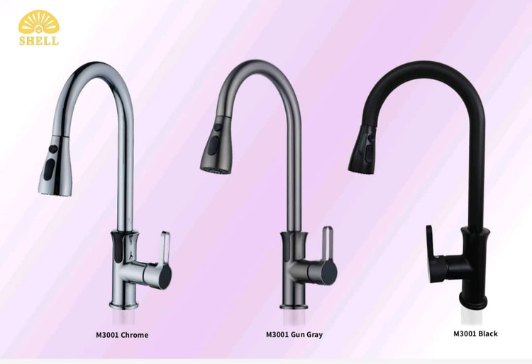 شیر ظرفشویی شاوری ( نمایشگر دیجیتال دمای آب روی قسمت بدنه / گوشی سه حالته ) برند Shell کد 3001 در رنگ های کروم ، دودی و مشکی موجود می باشد .