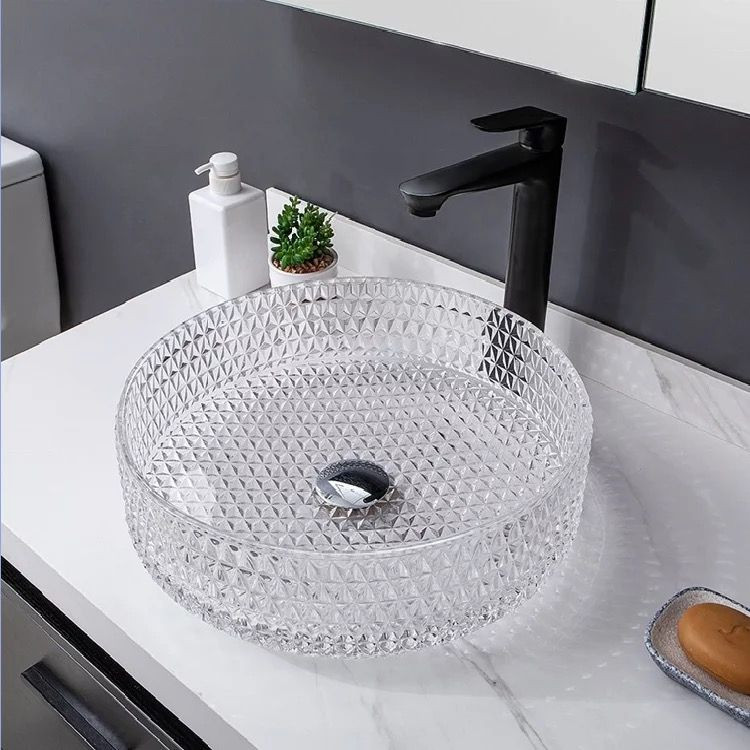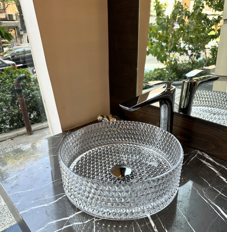 کاسه روشویی کریستال وارداتی از جنس شیشه و دایره ای شکل است.